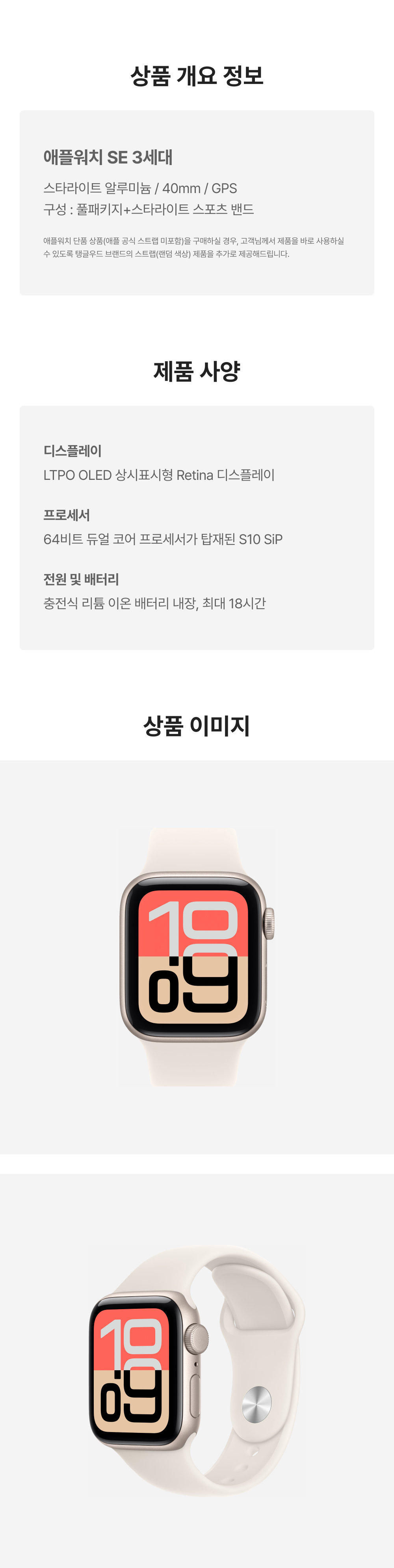 [S등급] 리퍼비시 애플워치 SE 3세대 40mm GPS 스타라이트 알루미늄 케이스 스포츠 밴드 스타라이트