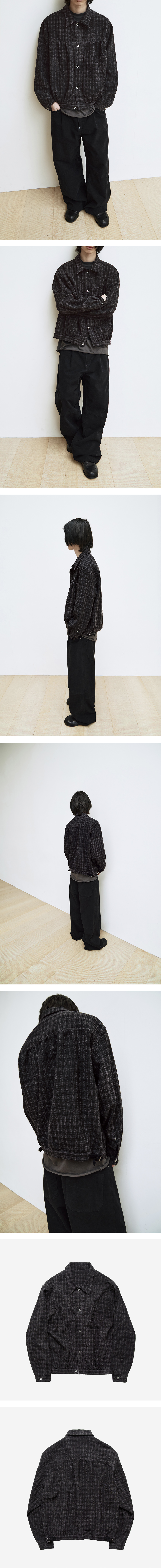 used trucker jacket - charcoal check 유즈드 트러커 베이스로 디자인 배리에이션 적용 된 모델. 러프한 외관에서 느껴지는 요철감이 특징적인 체크 트러커 자켓. 고전적인 트러커를 입체 패턴으로 재해석하여 특유의 볼륨과 섬세한 스티치 사양, 부자재 사용은 유지하면서 계절감에 적합한 두께감(셔츠에 가까운 경량감)으로 완성했습니다. 완성 이후 가먼트째 워시 하여 내추럴한 감도로 마무리하였습니다. 넉넉한 실루엣으로 완성되었으며 밑단 둘레를 조절할 수 있습니다. - 유즈드 트러커의 변형 자켓. - 가먼트 워시 - YKK 버튼 사용, 버튼 부착 후 워시하여 러프한 인상 - 요철감 있는 체크 배열 원단 사용 - 밑단 애드저스터 *모델: 178cm / 마른 체형, 3사이즈 착용