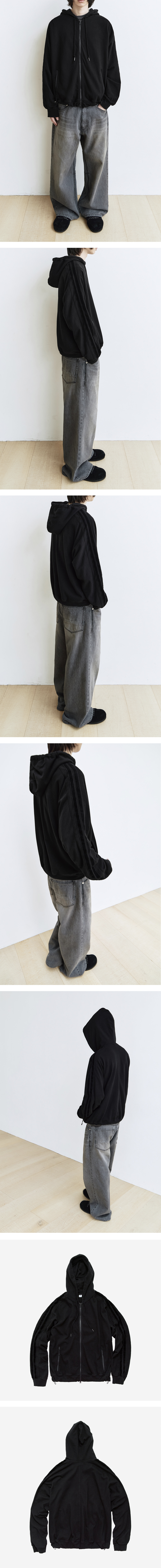 velour taped track hoodie - 일체형 슬리브 패턴이 적용된 트랙 후디 - 하이넥 및 카라 형태로 연출 가능한 넥 밸런스 - 여유로운 실루엣 구성 - 소매 벨루어 테이프드 사이드라인 디테일 적용 - 밑단 스트링을 통한 실루엣 조절 가능