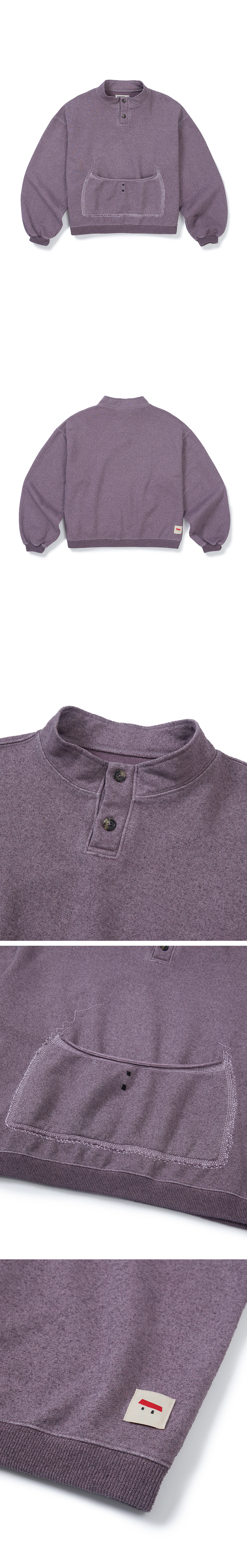 Product Info. - oatscoffee 시그니처 아인슈페너에서 착안한 디자인의 풀오버 - 피그먼트 가먼트 다잉 가공으로 산뜻한 컬러감과 빈티지한 텍스처 - 가벼운 원단감으로 간절기 착용에 적합한 아이템 - 러프한 핸드 스티치 무드의 패치드 포켓 자수 디테일 - 여유로운 실루엣과 크롭 기장으로 균형 잡힌 밸런스 - 넥 여밈부 마블 패턴의 소뿔 버튼 사양 - oatscoffee 시그니처 직조 라벨 포인트