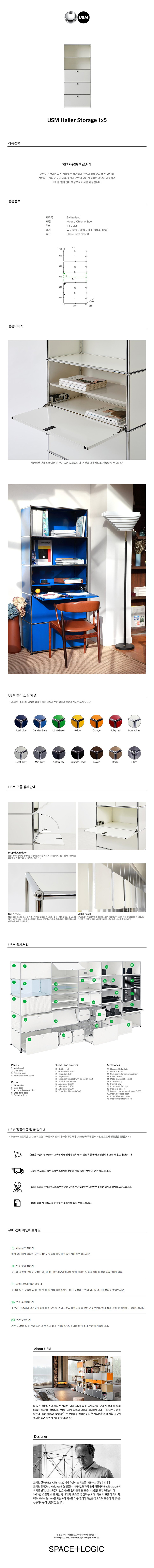 5단으로 구성된 모듈로, 오픈형 선반에는 자주 사용하는 물건이나 오브제 등을 전시할 수 있으며, 드롭다운 도어 내부 수납장에는 중요한 물품을 수납할 수 있습니다. 첫번째 드롭다운 도어 내부 중간에 선반이 있어 효율적인 수납이 가능하며 도어를 열어 간이 책상으로도 사용 가능합니다.