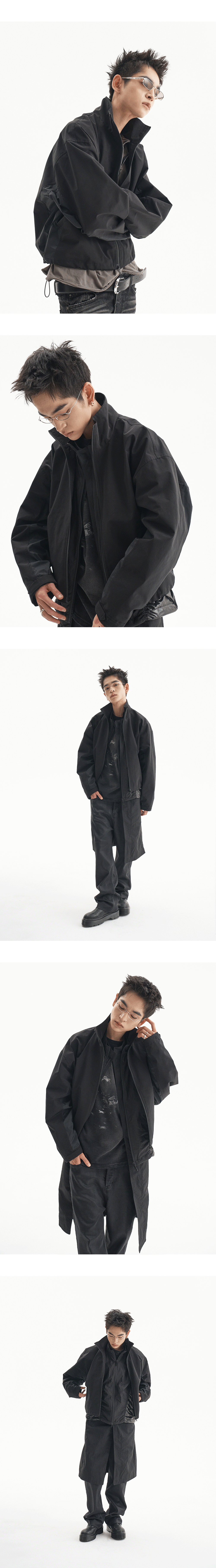 3레이어 원단으로 제작된 크롭 기장의 하드 쉘 자켓입니다. 견고한 원단감과 구조적인 실루엣이 특징이며, 방풍·방수의 기능성과 함께 날카로운 아웃라인을 연출합니다. MODEL 1 : 180CM / 61KG WEARING SIZE : 1 MODEL 2 : 177CM / 59KG WEARING SIZE : 2