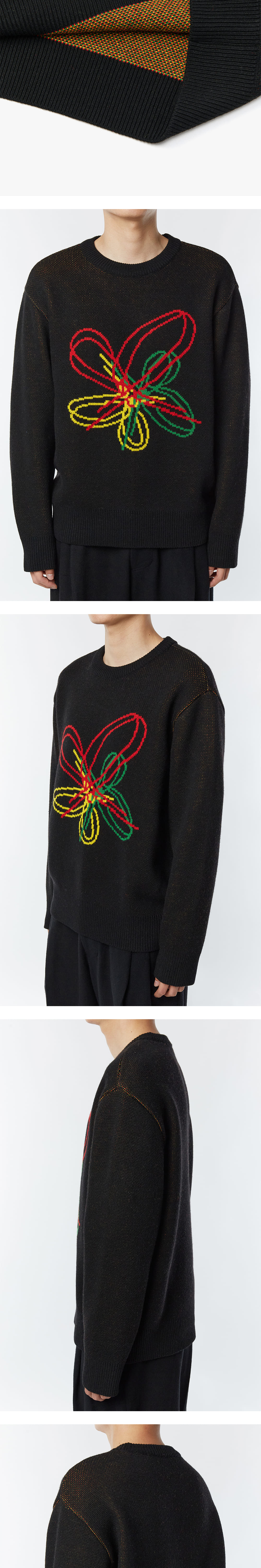 '타이핑미스테이크의 22FW 시그니처 그래픽을 담은 니트입니다. 4도 자가드 편직으로 가을 겨울에 이너와 단독의 기능성을 극대화 시켰습니다. 단색의 면에도 은은한 컬러감을 더해 타이핑미스테이크만의 특유의 감도를 더하였으며, 여유로운 실루엣과 넉넉한 볼륨감으로 웨어러블하게 입기 좋습니다. 니트에서 쟈카드란 원사만을 사용해서 그래픽을 나타내는 방법으로도 쓰입니다. 쟈카드 니트는 실 자체를 컬러별로 여러개로 나눠서 일반 조직과는 다르게 실의 조직이 X자로 꼬여지는데, 엑스자로 꼬여지는 것은 보통의 플레인 도목에서는 나타낼 수 없는 탄력감있는 조직을 표현할 수 있습니다. 해상도에 따라서 색상 차이가 있을 수 있습니다.