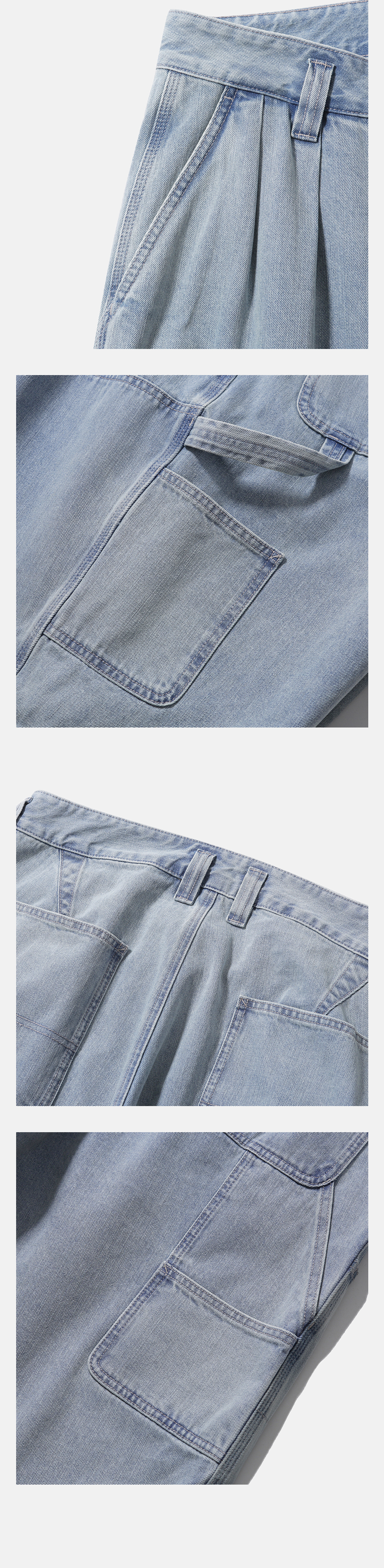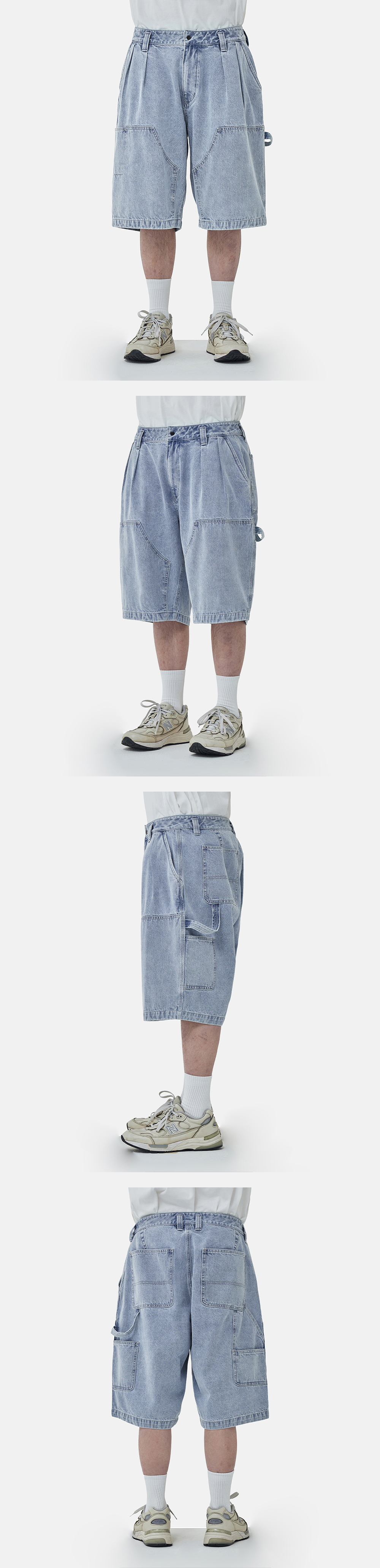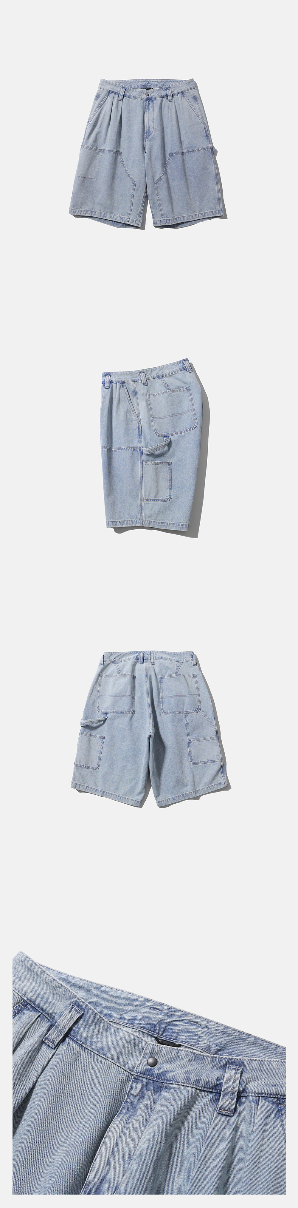 워크 웨어의 디테일을 담은 데님 반바지 · 와이드 한 오버사이즈 실루엣. · 11.3온즈의 데님 원단 사용. · 사이드 주머니와 뒷주머니 패치 포켓 사양. · 후면부 다양한 사이즈의 보조 주머니와 해머 루프 디테일. · 허벅지 부분 보강 패치 디테일. · 지퍼 플라이 사양. · 허리에 턱을 넣어 편안한 착용감과 풍성한 실루엣 연출.