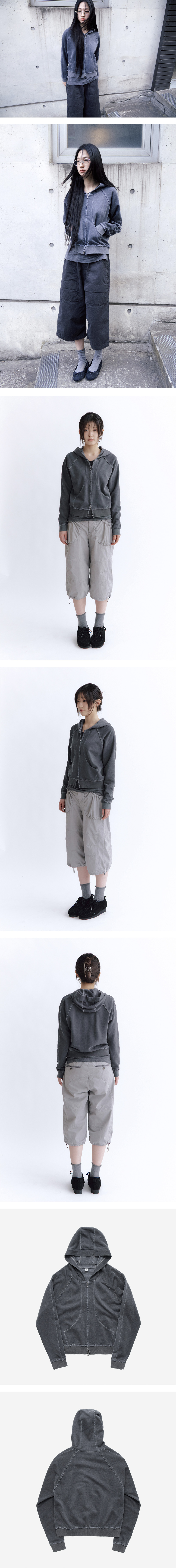 women cropped zip hoodie - 러프한 인상의 크롭 기장 후드 집업 - 빈티지한 색감 - 로우컷(raw-cut) 마감 - 넉넉한 후드 실루엣 - YKK 투웨이 지퍼 사용 - 전면부 2개의 포켓 구성 *모델 1: 169cm / 마른 체형, F 사이즈 착용 *모델 2: 169cm / 마른 체형, F 사이즈 착용