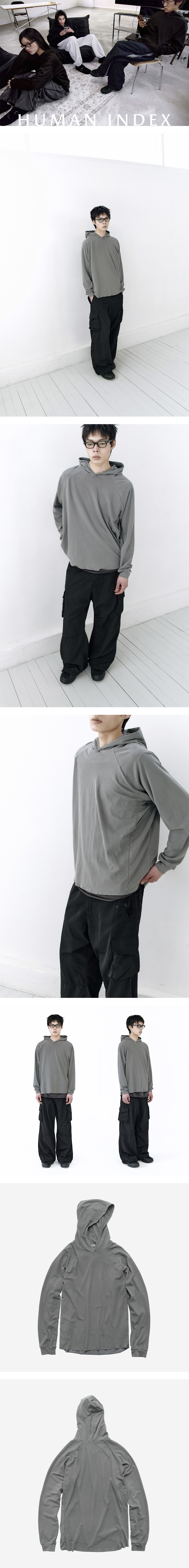 human single hoodie -넉넉한 크기의 후드 -메쉬 안감 적용 -러프한 밑단 마감 -레이어드에 용이한 두께감 *남성 모델 : 180cm / 마른 체형, 4사이즈 착용