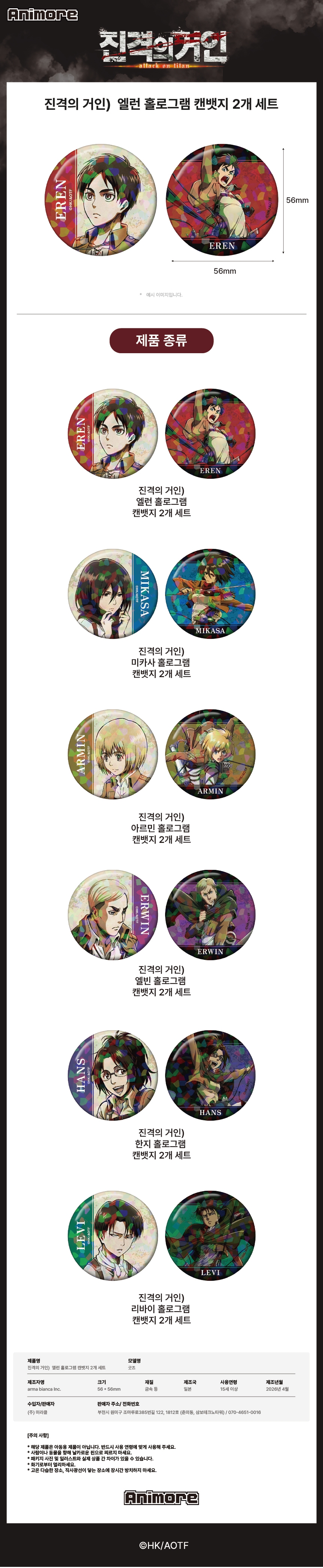 [예약배송] 애니모어 진격의 거인 엘런 홀로그램 캔뱃지 2개 세트
