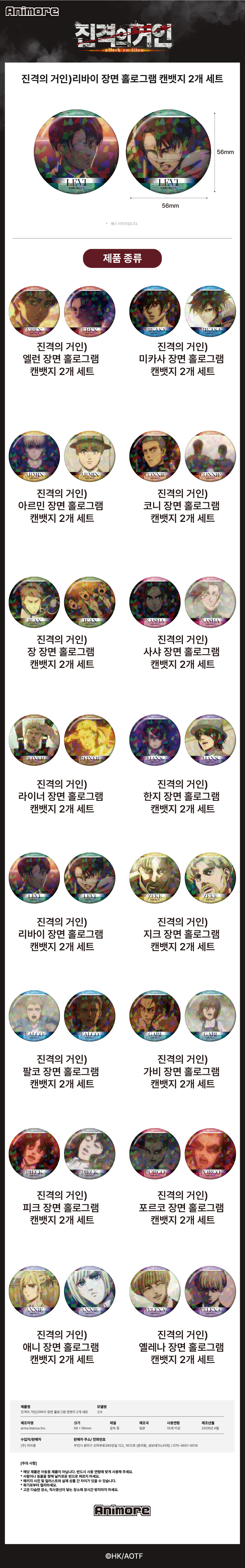 [예약배송] 애니모어 진격의 거인 리바이 장면 홀로그램 캔뱃지 2개 세트