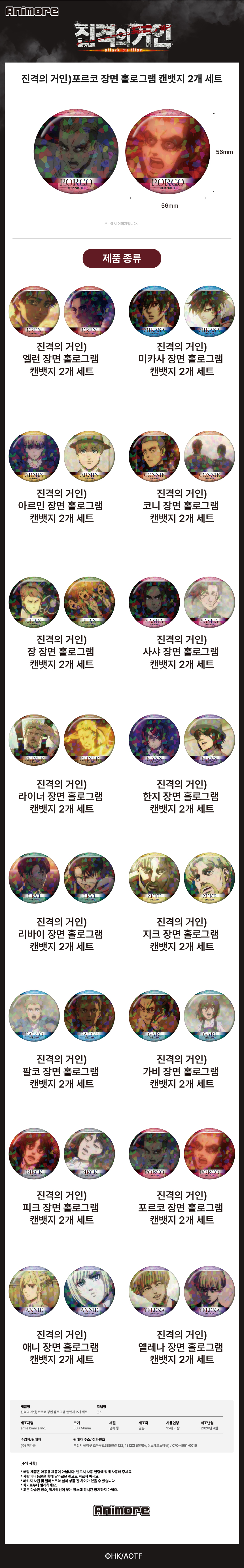 [예약배송] 애니모어 진격의 거인 포르코 장면 홀로그램 캔뱃지 2개 세트