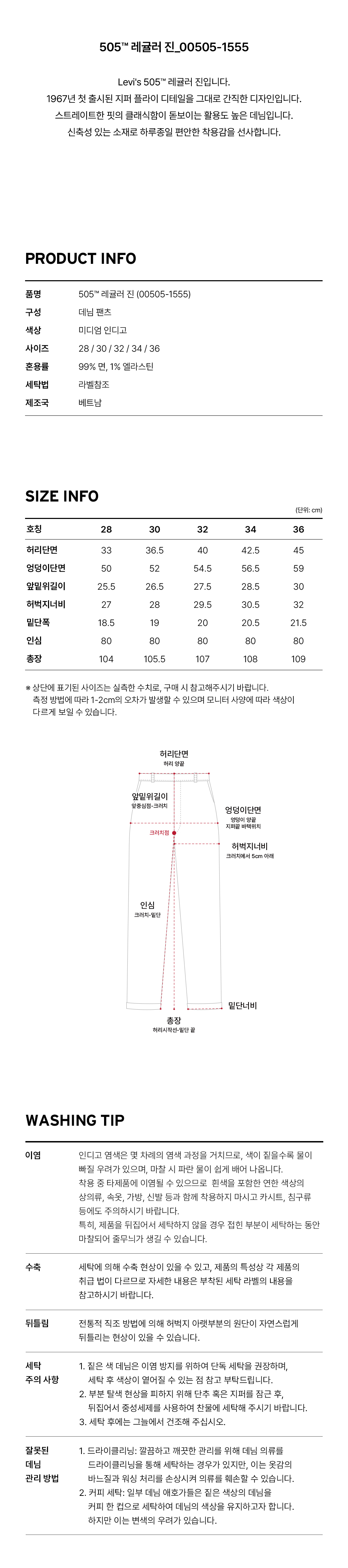 리바이스 505 레귤러 핏 진 미디엄 인디고