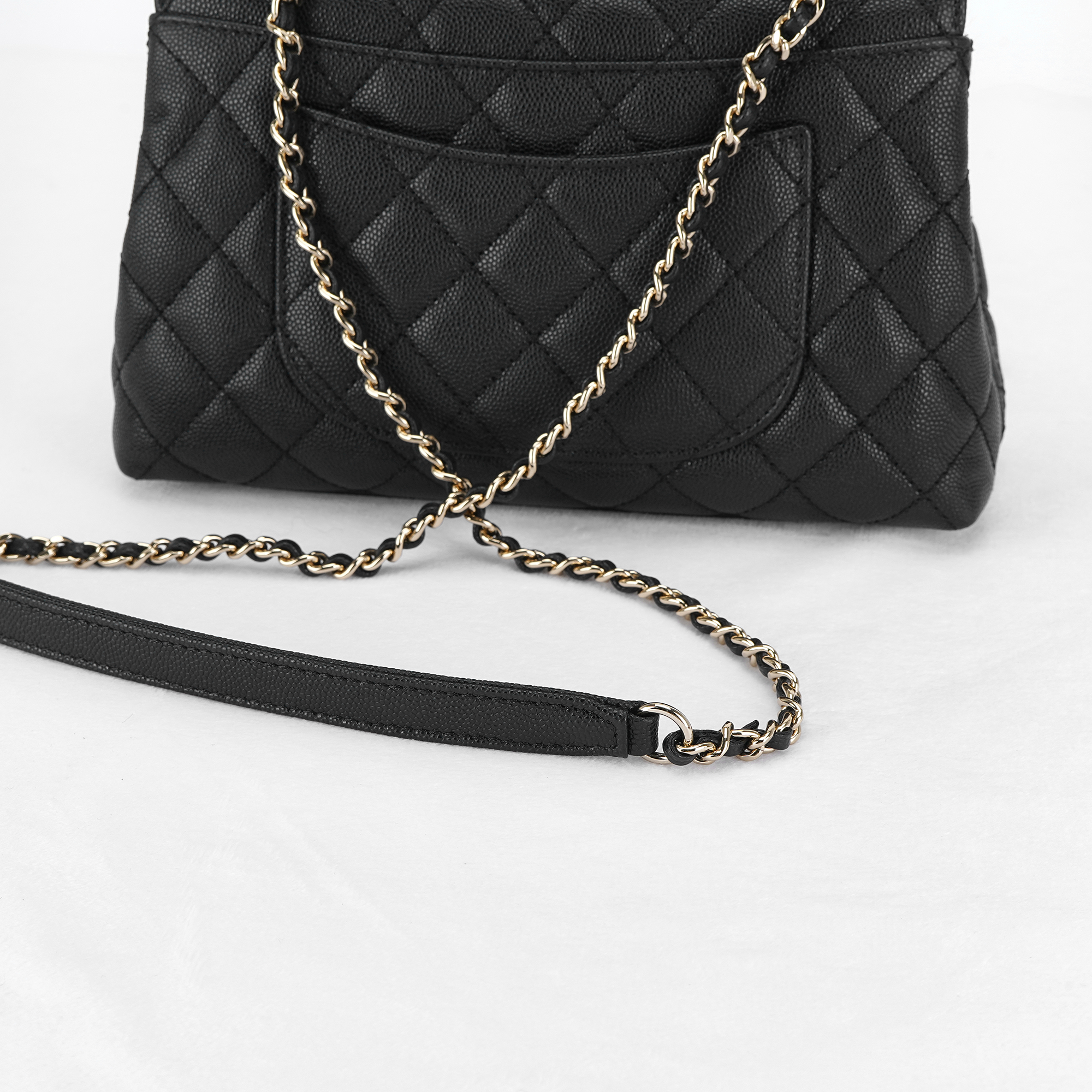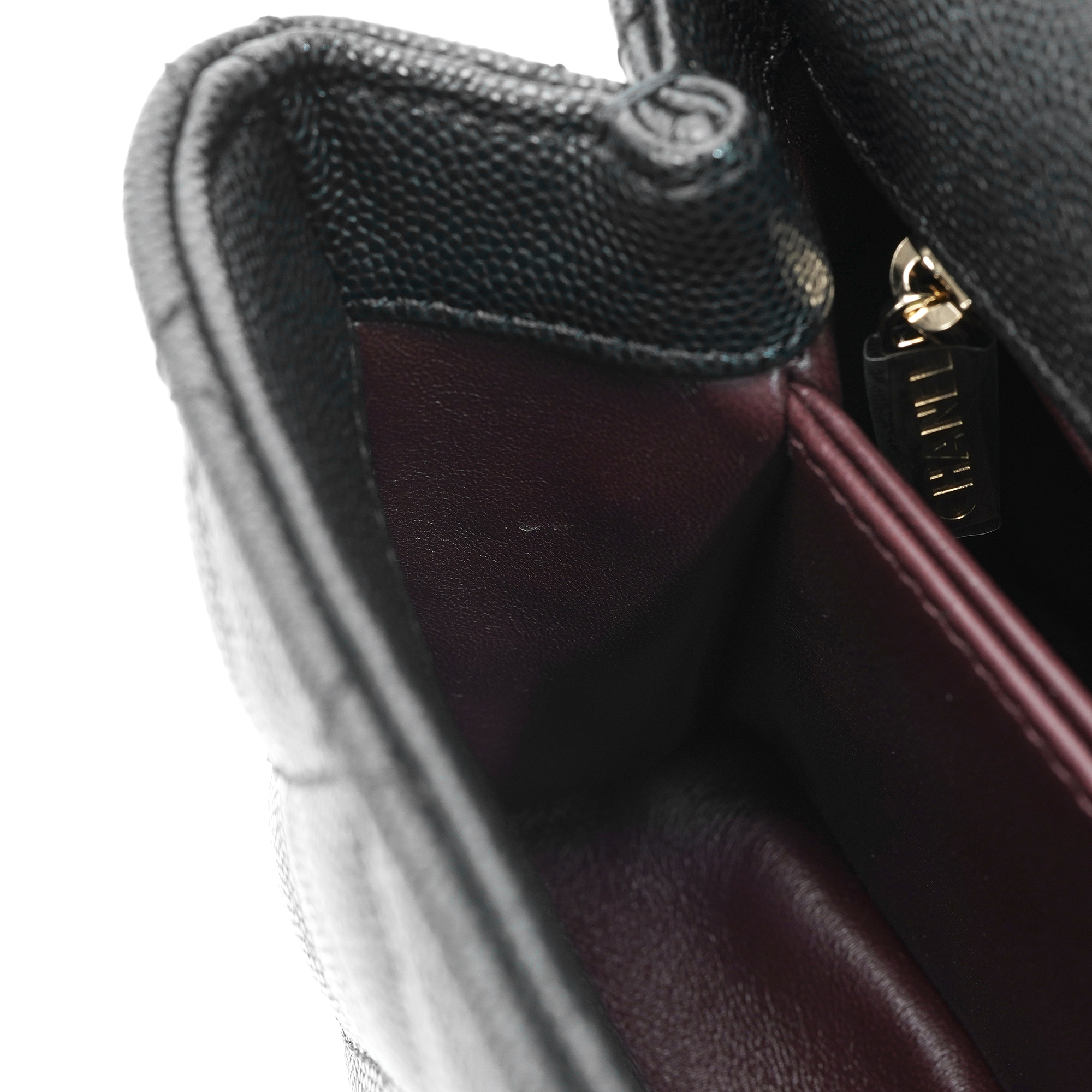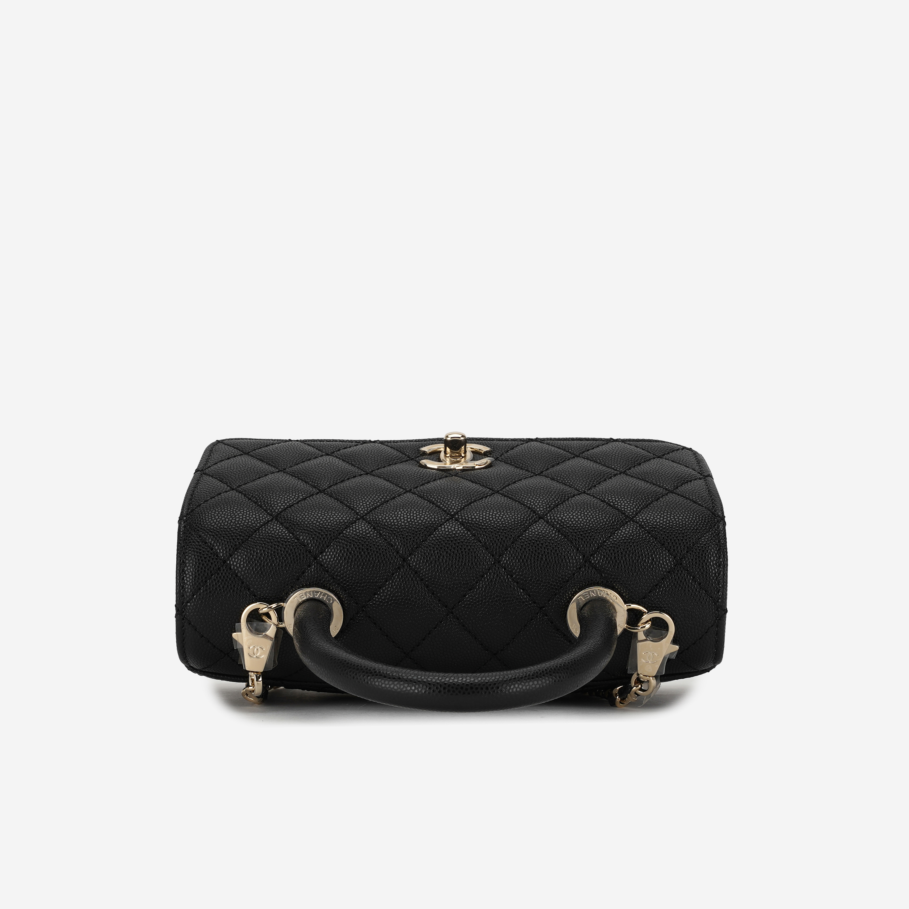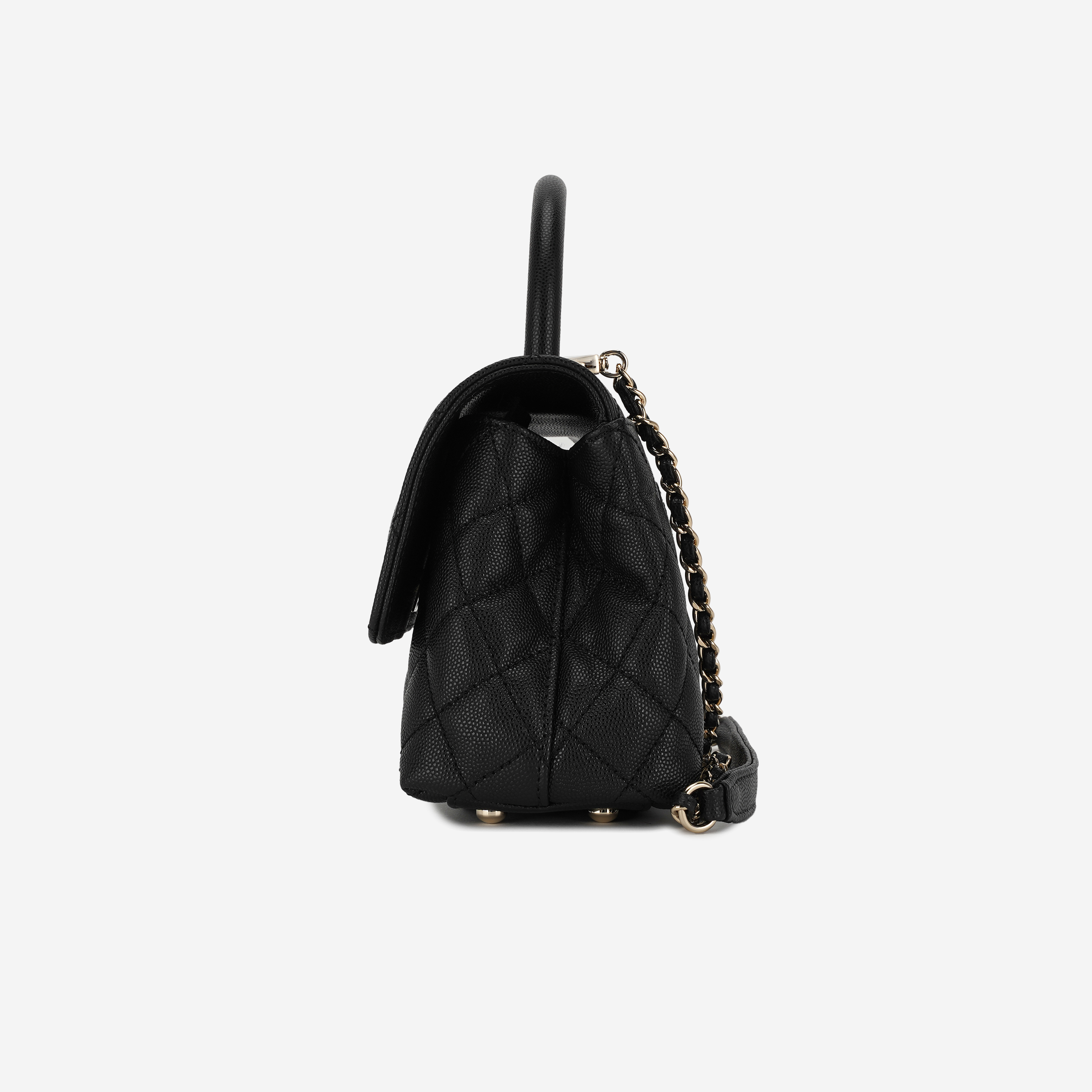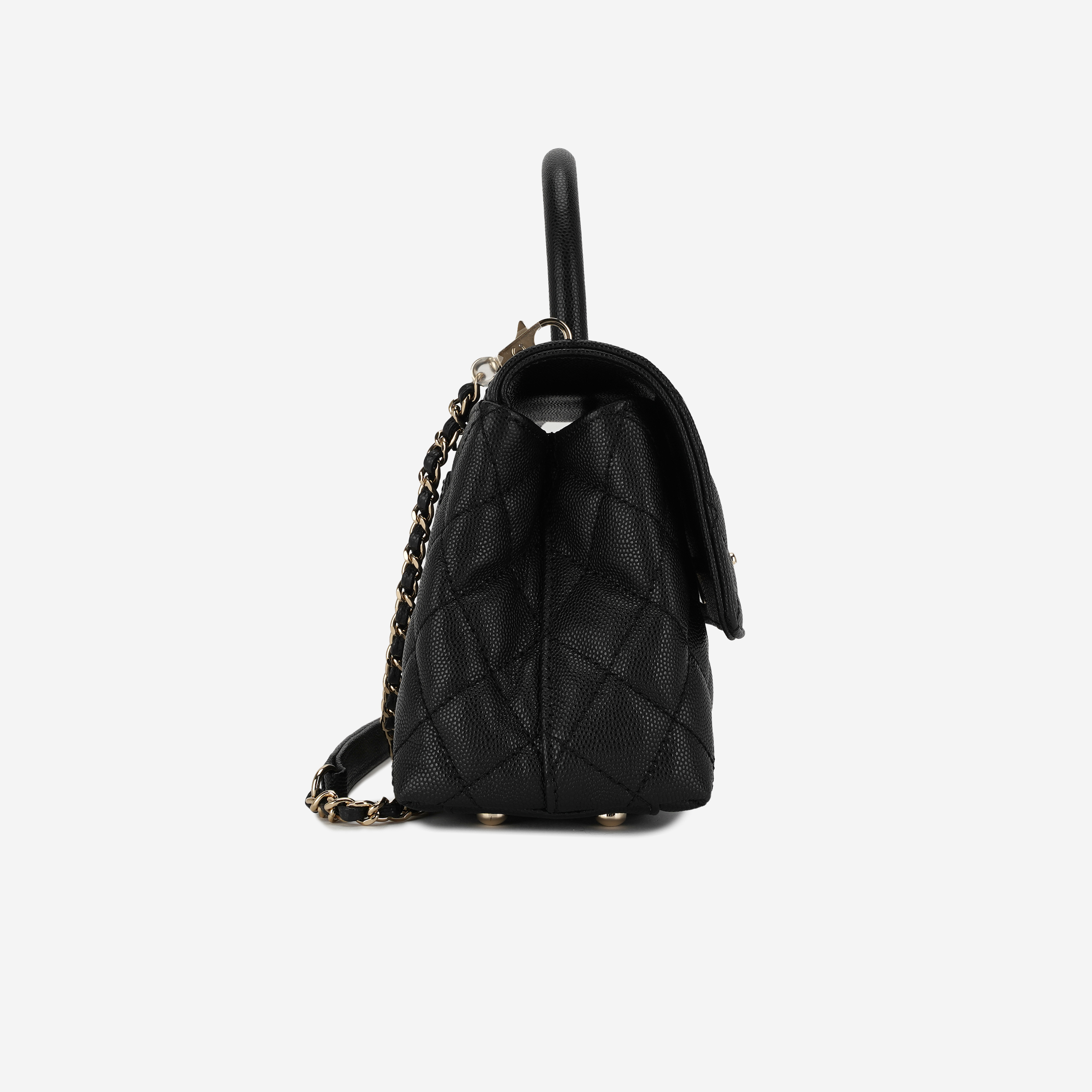 샤넬 핸들 장식의 스몰 플랩백 그레인드 카프스킨 & 골드 메탈 블랙
