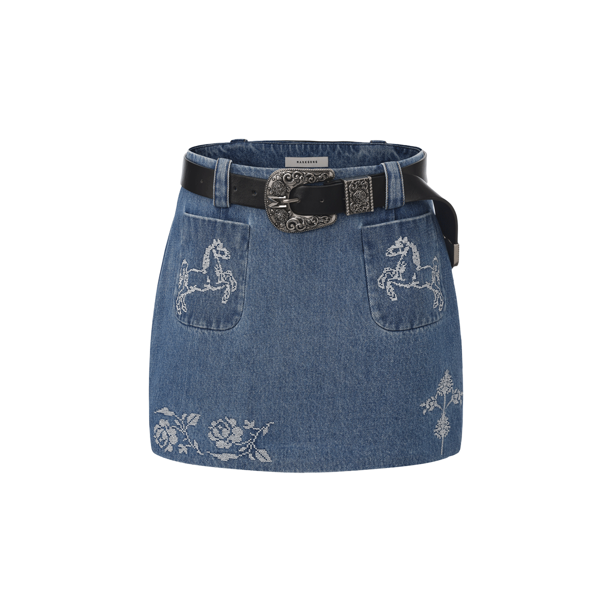 마크공 우먼 블루 크로스 스티치 엠브로이더드 데님 스커트 위드 디태처블 벨트 블루 - 26SS