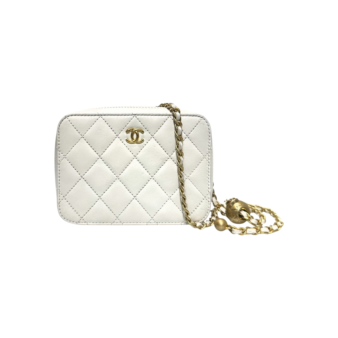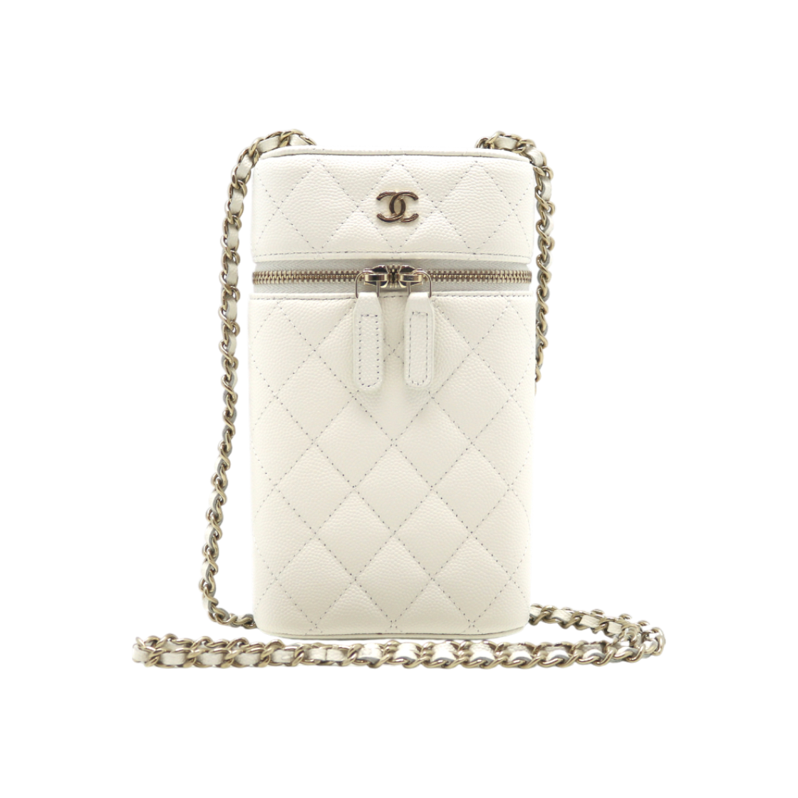샤넬 스몰 체인 코스메틱 케이스 그레인드 카프스킨 & 골드 메탈 화이트