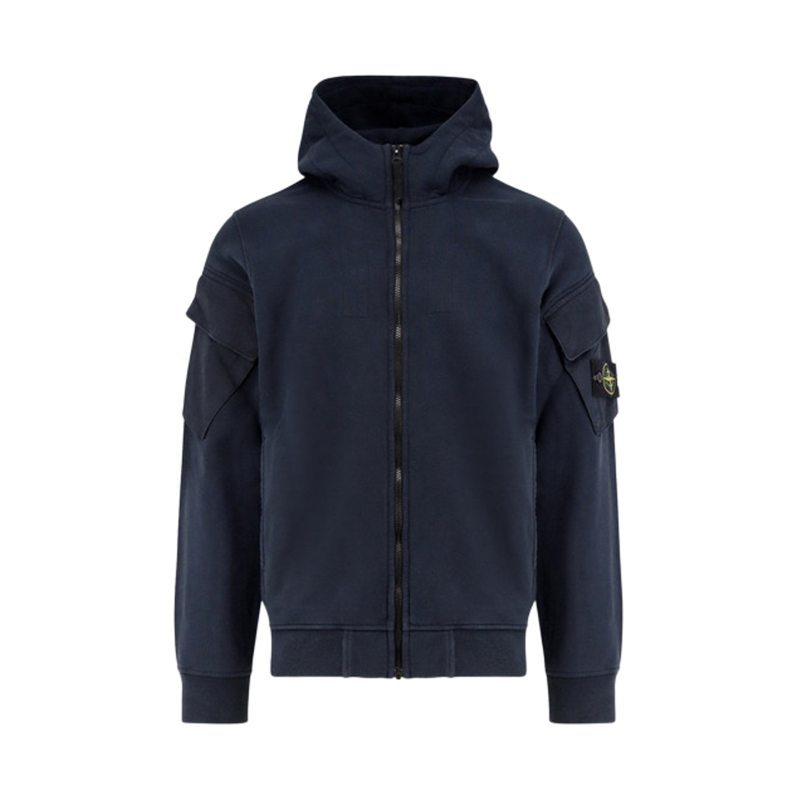 스톤 아일랜드 63341 오가닉 코튼 다이애그널 플리스 올드 이펙트 포켓 후드 풀 지퍼 스웨트셔츠 네이비 블루 - 24FW