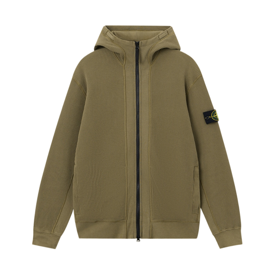 스톤 아일랜드 6100058 오가닉 코튼 와플 플리스 레귤러핏 집업 후드 스웨트셔츠 포켓 밀리터리 그린 - 26SS