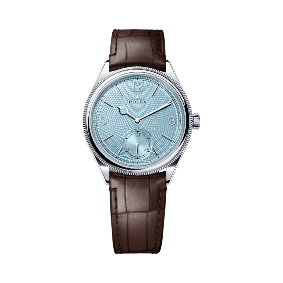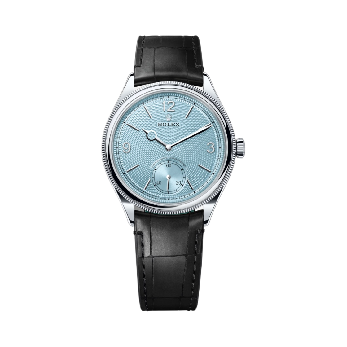 롤렉스 퍼페추얼 1908 39mm 52506 아이스 블루 라이스 그레인 모티프 플래티넘 엘리게이터 스트랩 브레이슬릿