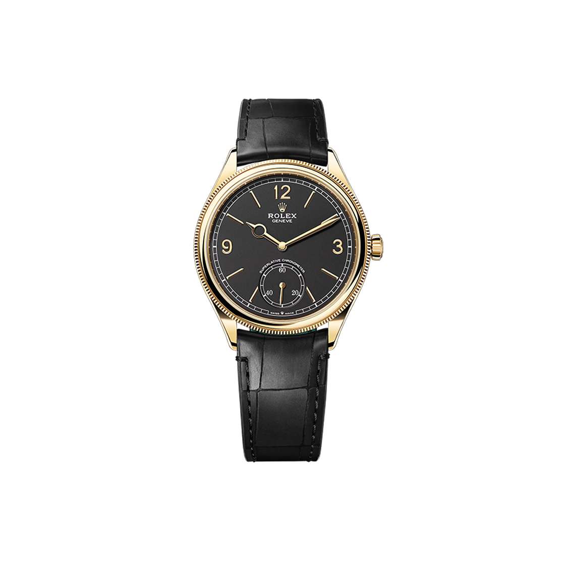 롤렉스 퍼페추얼 1908 39mm 52508 인텐스 블랙 옐로우 골드 엘리게이터 스트랩 브레이슬릿